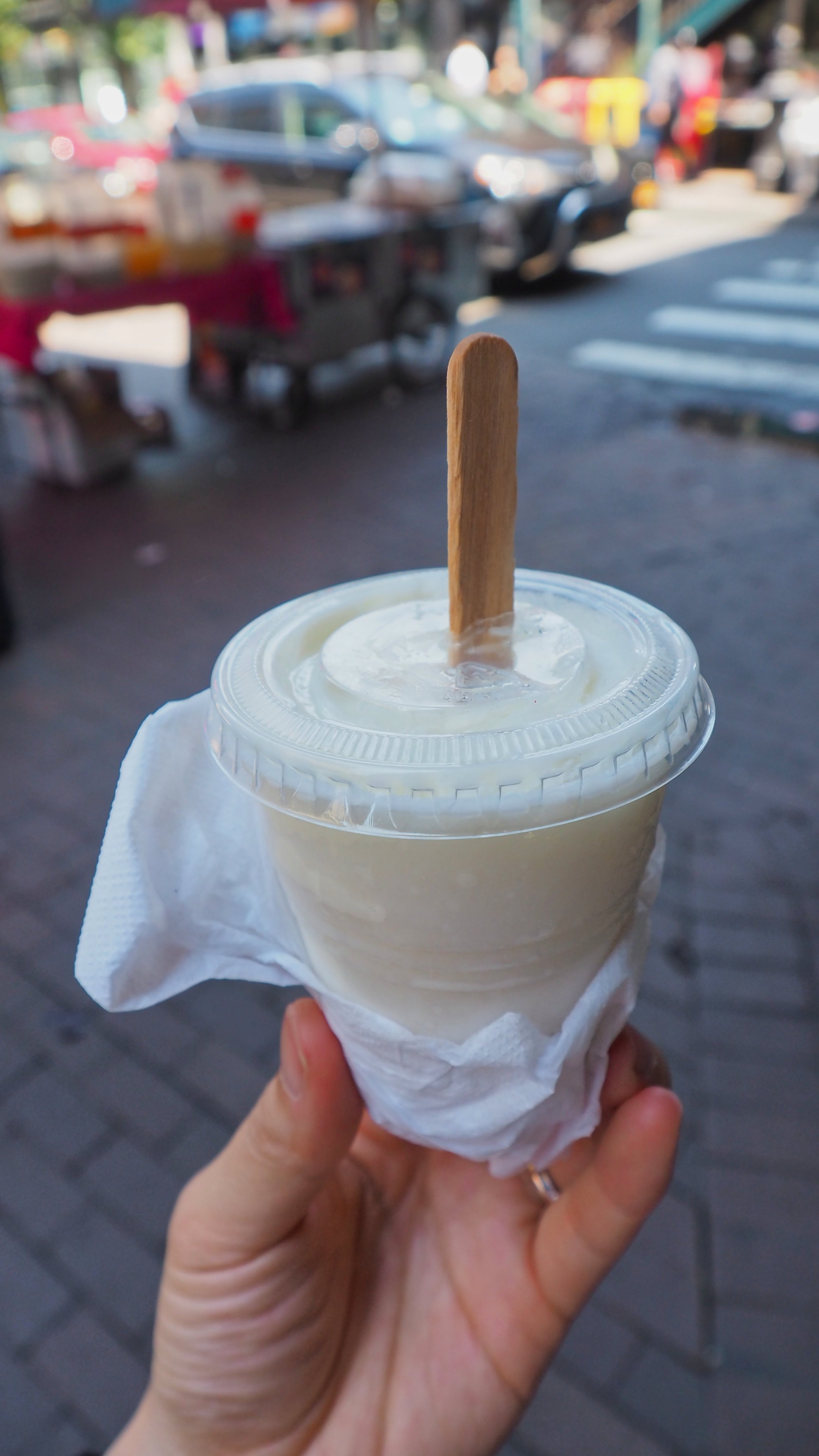 These unassuming stands (not quite food trucks) are scattered throughout Jackson Heights, on street corners and tucked underneath the subway overpasses. They don’t look like much but don’t overlook them! The juices are more like smoothies blended to order and have all of the real stuff (fruits, veggies, and supplements as requested) and no filler or additional sweetener. And that little coconut ice pop in a tiny plastic cup may have been the best thing I consumed all day. This may have had to do with the fact that the temperature was >90 degrees the day we embarked on our food truck tour full of trekking around eating spicy food under the sun…but still, that coconut ice was DELICIOUS.