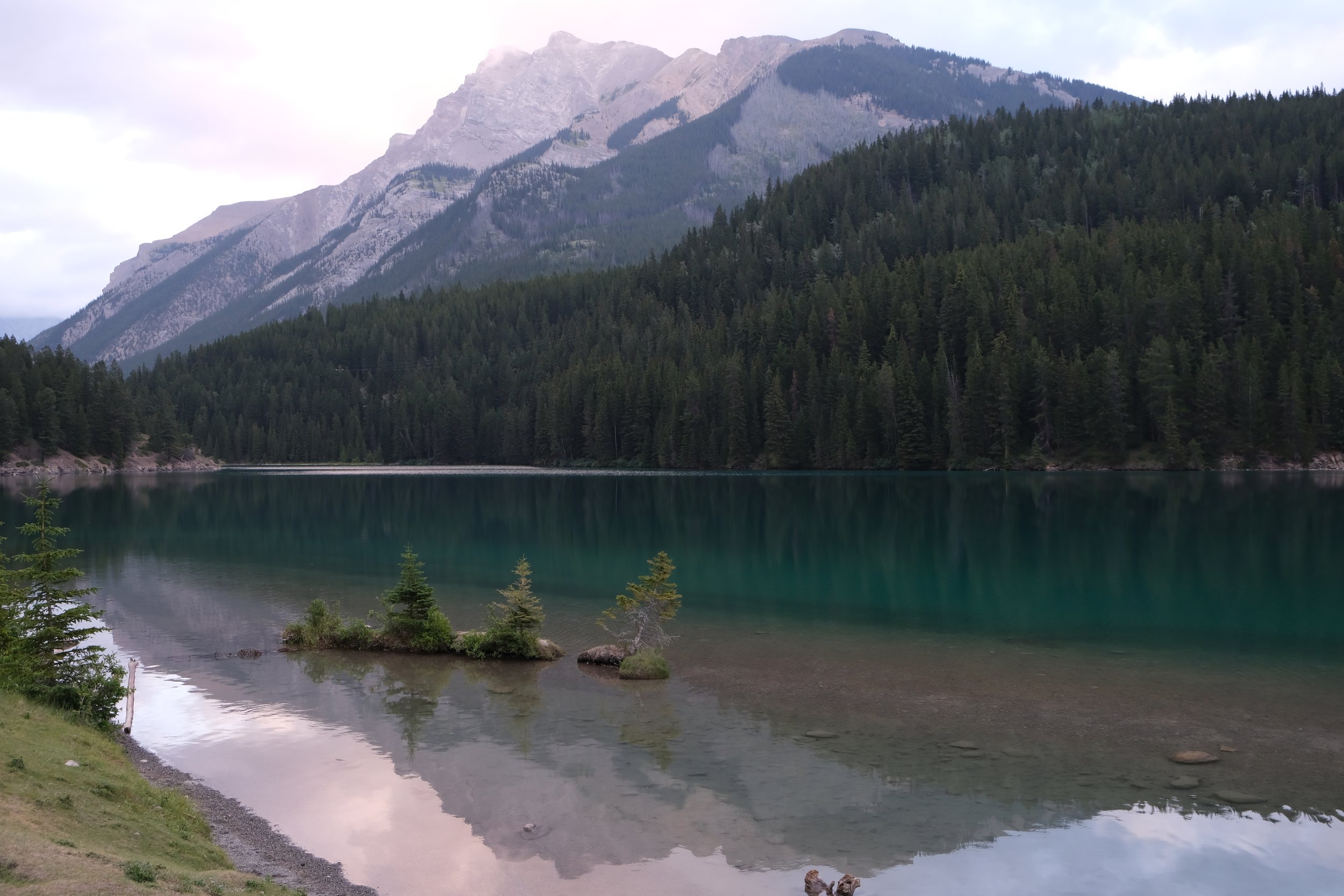 Our first morning waking up in Banff National Park, we rose early to catch the sunrise at Vermillion Lakes which is near downtown Banff. It was a little cloudy for sunrise but was still beautiful. I enjoyed the peace sitting by the water, brewing coffee in the outdoor mist, waiting for the light to shine on the face of Mount Rundle before us.