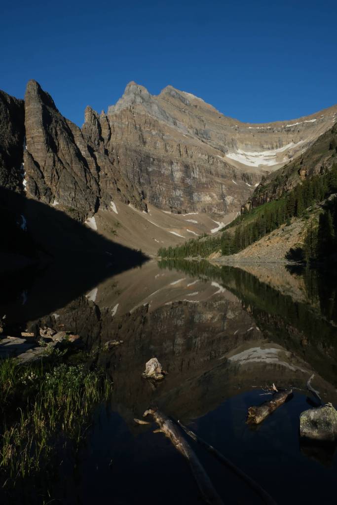 The hike to Lake Agnes is quite quick, taking only about 30 minutes from Lake Louise. You’ll pass by Mirror Lake which is small but charming, and (fittingly) very reflective. At Lake Agnes, you can’t miss the Lake Agnes Tea House, where you can order a cup of tea ($4.50) and biscuits (2 for $8.00) or a variety of other drinks and nibbles. The Lake Agnes Tea House staff hike up to the tea house every day, carrying all the needed supplies and ingredients with them.