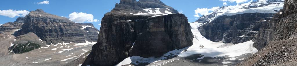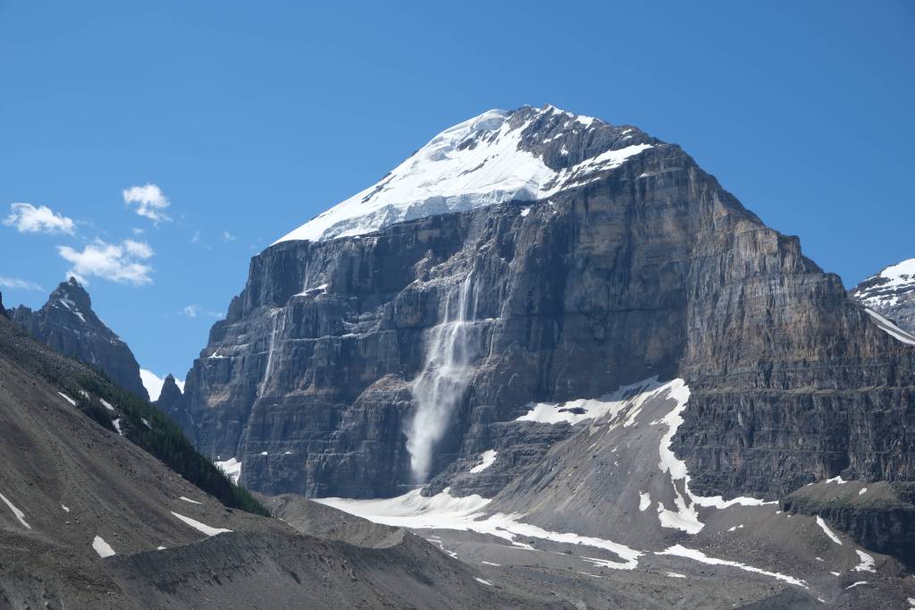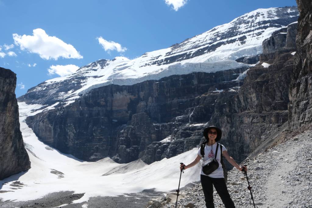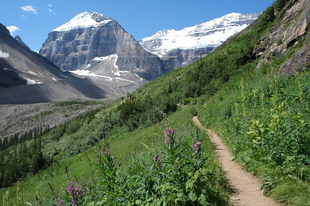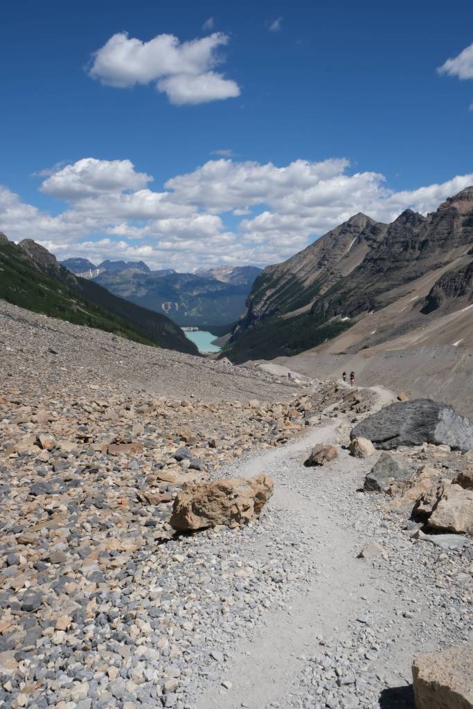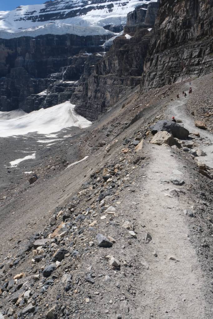 After finishing the Big Beehive hike and returning to Lake Agnes, you have the option of hiking back to Lake Louise or continuing on. We decided to continue on the Highline Trail to get to the Plain of Six Glaciers! In hindsight, we should have refilled our water bottles before embarking on this next leg of the journey. The Plain of Six Glaciers is 5km one way from Lake Agnes and the vast majority of the trek is in unsheltered sun. Even though we were in Canadian mountains surrounded by glaciers, July sun is hot and we got extremely dehydrated by the end.