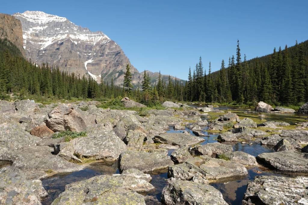 Consolation Lakes trail ends in a huge field of fallen rocks which bleeds into the lakes.