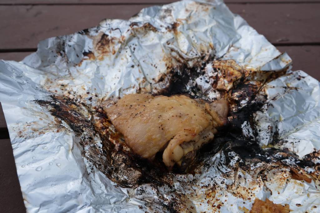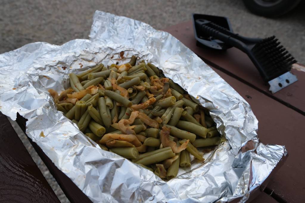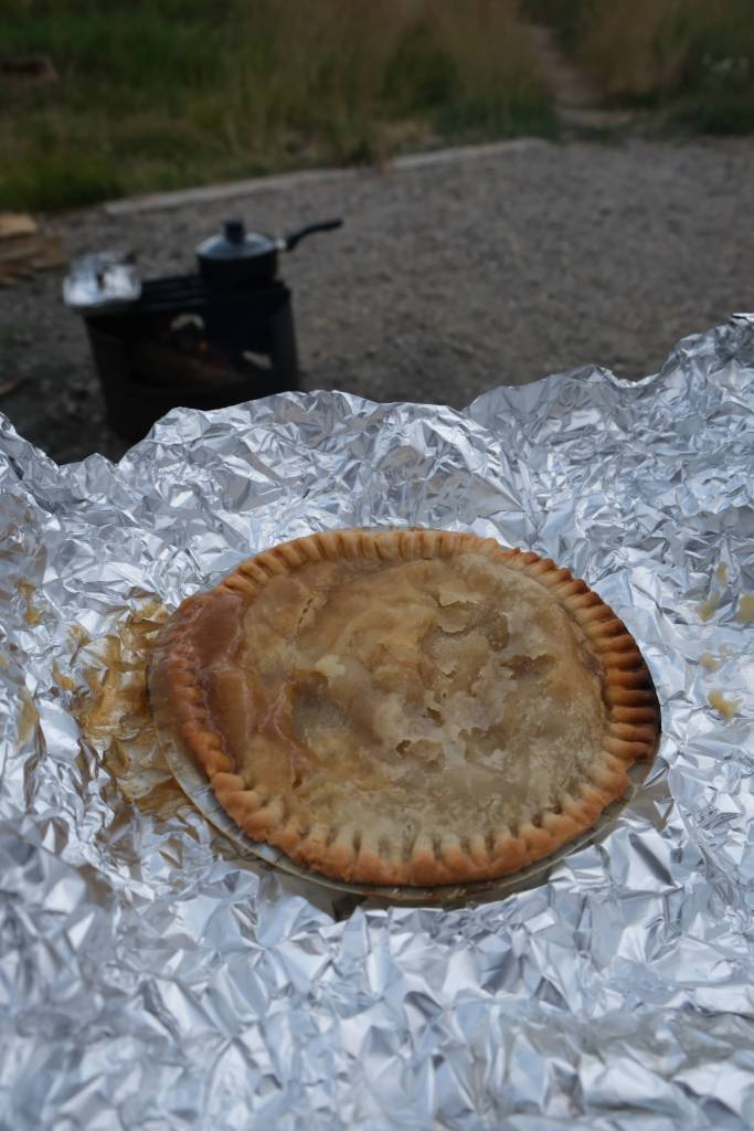 After a beer break at the Whistle Stop Pub in the town of Jasper, we returned to our site at the Whistler Campground for another “camp-cooked” dinner. Tonight’s menu included campfire-grilled pot pie, chicken, and green beans.