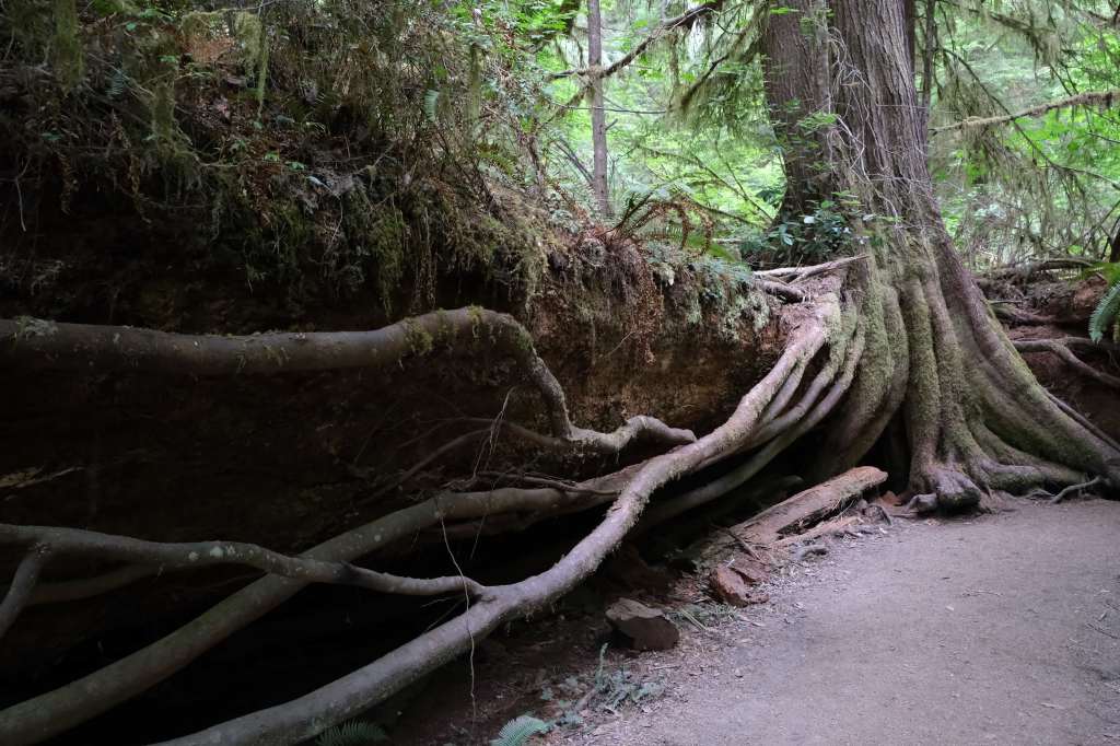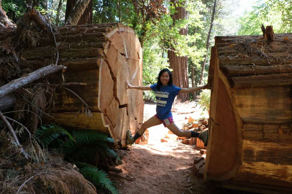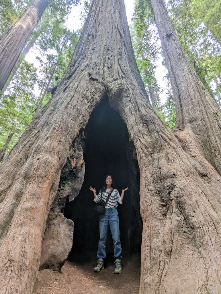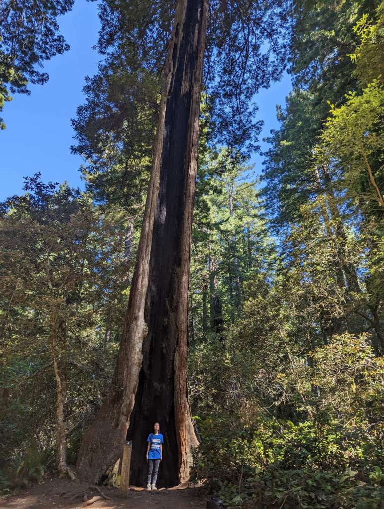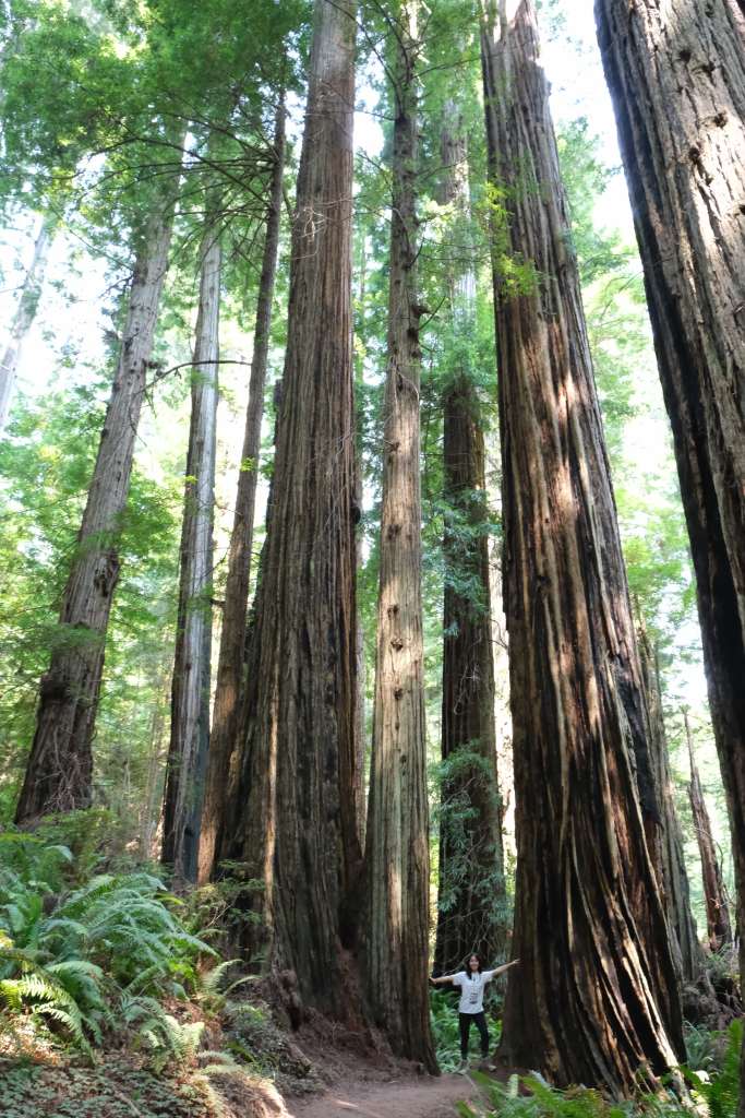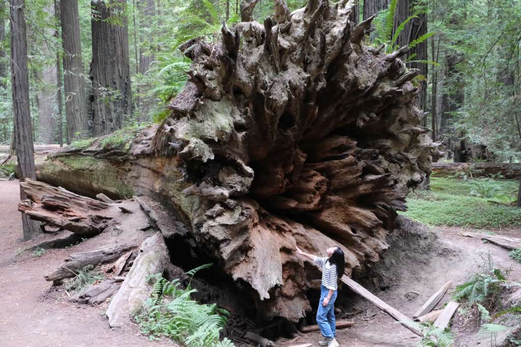 The Grove of Titans Trail, while short and easy, ranks super high on the effort:reward ratio. The history of this trail is that rumors spread of a grove of old-growth redwoods trees where several of the largest redwoods in the area happened to grow in very close proximity. The spot became too popular, and as more hikers veered off trail to find this almost mythical grove of ancient giants, more and more of the forest underbrush was destroyed. The National Park Service finally decided to create an official trail to mitigate the collateral damage, using elevated metal walkways to protect the ferns below. These walkways had to be carried up to the trail site by hand! The Grove of Titans Trail is not wheelchair accessible due to some stairsteps, but it otherwise is a super easy trail. The metal walkways provide even footing which allows you to focus less on your steps and more on the gigantic trees above you. Some trees here are over 2,000 years old. My favorite tree was actually not one of the “Titans” but a big tree growing around a nurse log (logs from previously fallen trees whose decomposing organic material provides excellent nurturing grounds to “nurse” other saplings and plants). Most trees seen perched on nurse logs are small, but this one was a full grown tree with huge roots wrapping around the nurse log like a giant octopus.