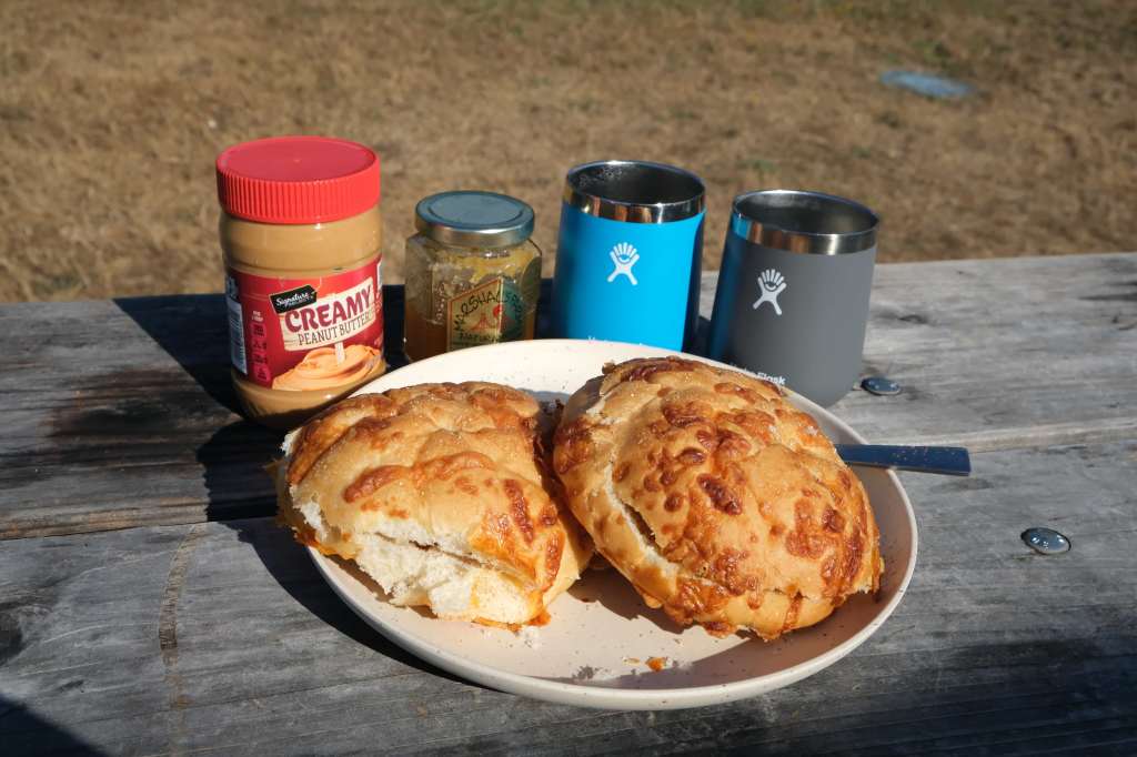 Were we bored of it yet? Apparently not. Breakfast on our last morning in the camper van was cheese bread, peanut butter, honey, and cinnamon. And a coffee.