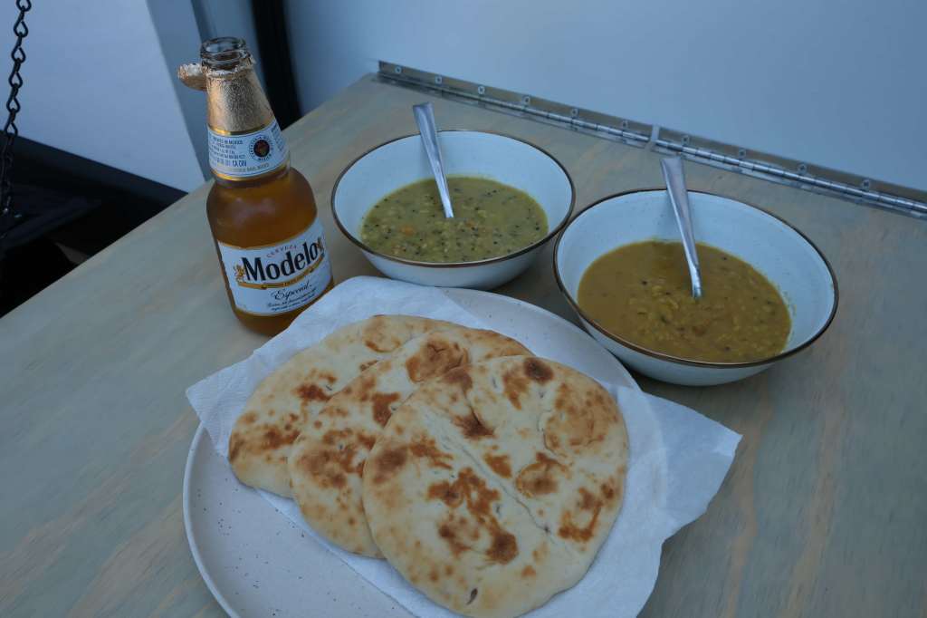 Lunch was curried lentils with garlic naan.