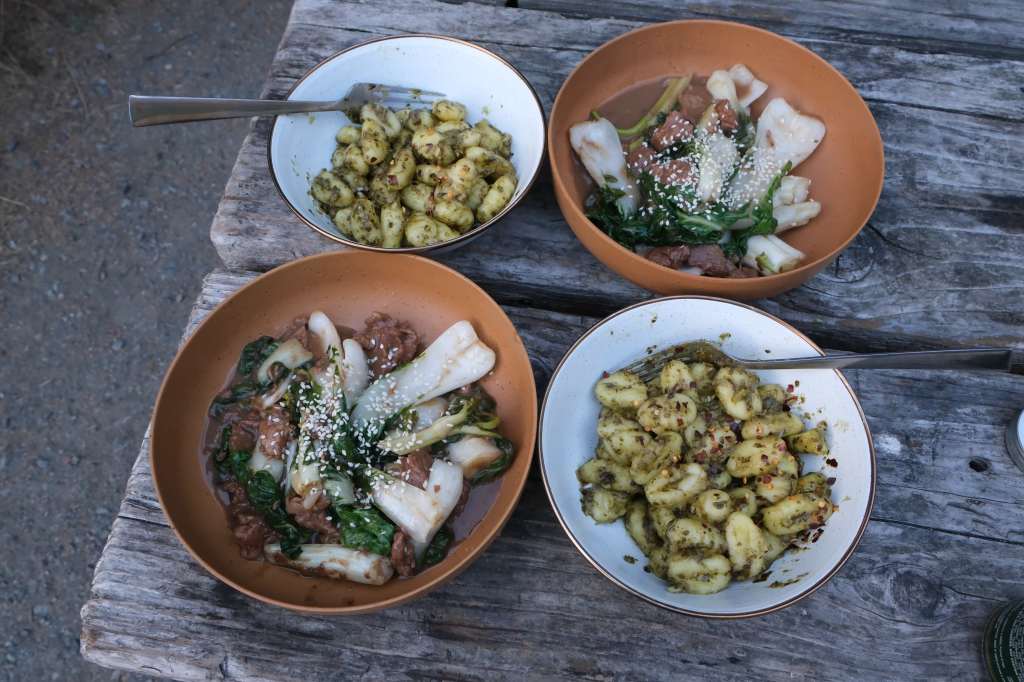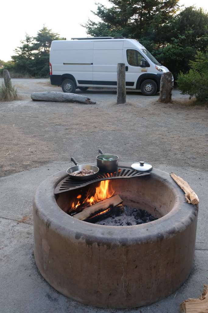 Our last night spent in the van was at Mill Creek Campground a little south of Crescent City. We made a huge dinner in the efforts to finish our food before our camping trip concluded. Over the campfire, we prepared Chinese veggies with Chinese sausage, garlic “french fries,” rigatoni with ground beef in cacio e pepe sauce, and tomato soup.