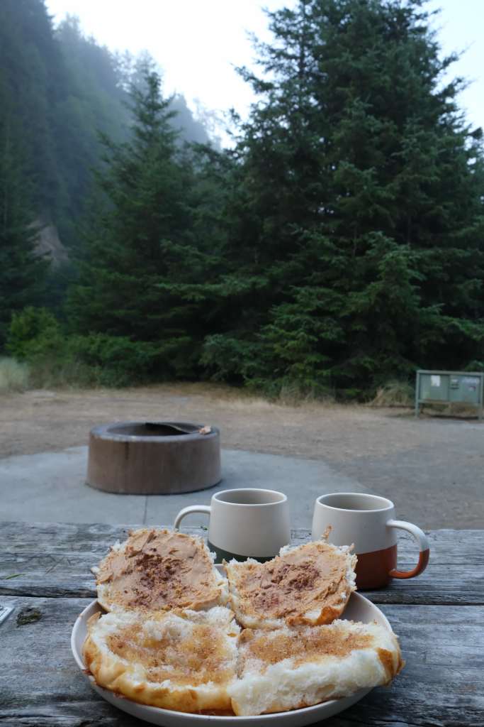 Our first breakfast in the Redwoods featured cheese bread spread with peanut butter, honey, and cinnamon. This, we’d come to learn, would become a beloved trend on this trip.