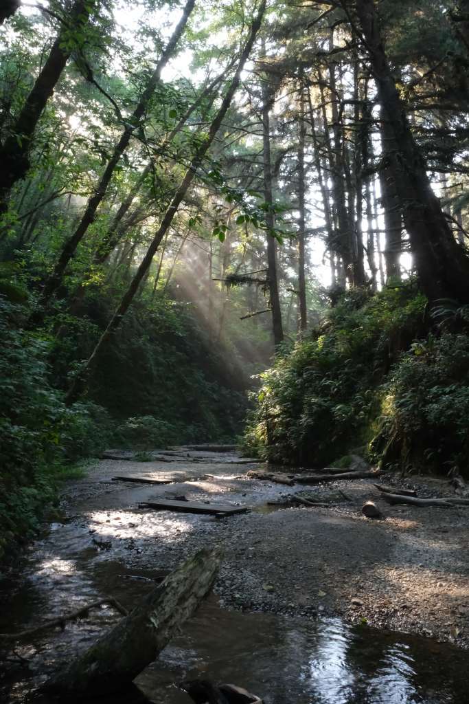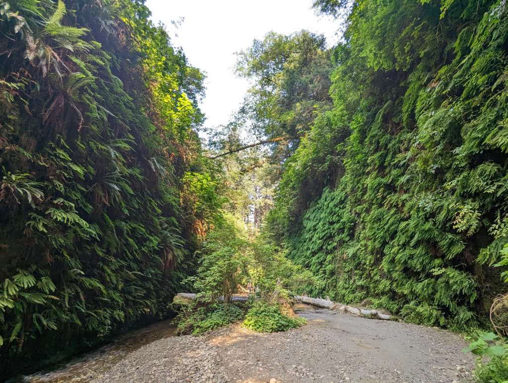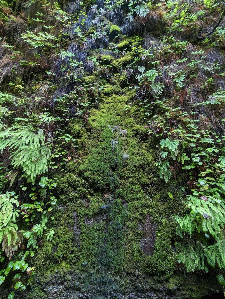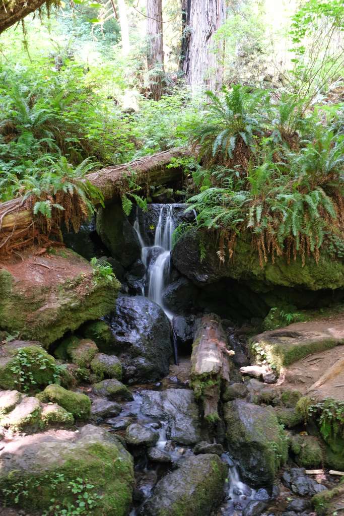 Please be aware that the drive along Gold Bluffs Beach is riddled with (deep) potholes and you have to dive your car through a shallow stream. Our van made it through, and we even saw some daring smaller cars traversing but proceed with caution! Once at the canyon itself, you’ll be awestruck by the number of ferns and mosses completely covering the canyon walls. This canyon was created by a retreating sea millions of years, and some of the many fern species have ancestors that date back 325 million years! The scene of the babbling brook below, a fuzzy swath of green ferns hanging from and swaying along the canyon walls, vertical moss carpets slowly dripping water was just so good that after completing the loop once we decided to go back and explore the canyon a second time.