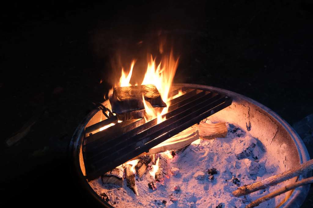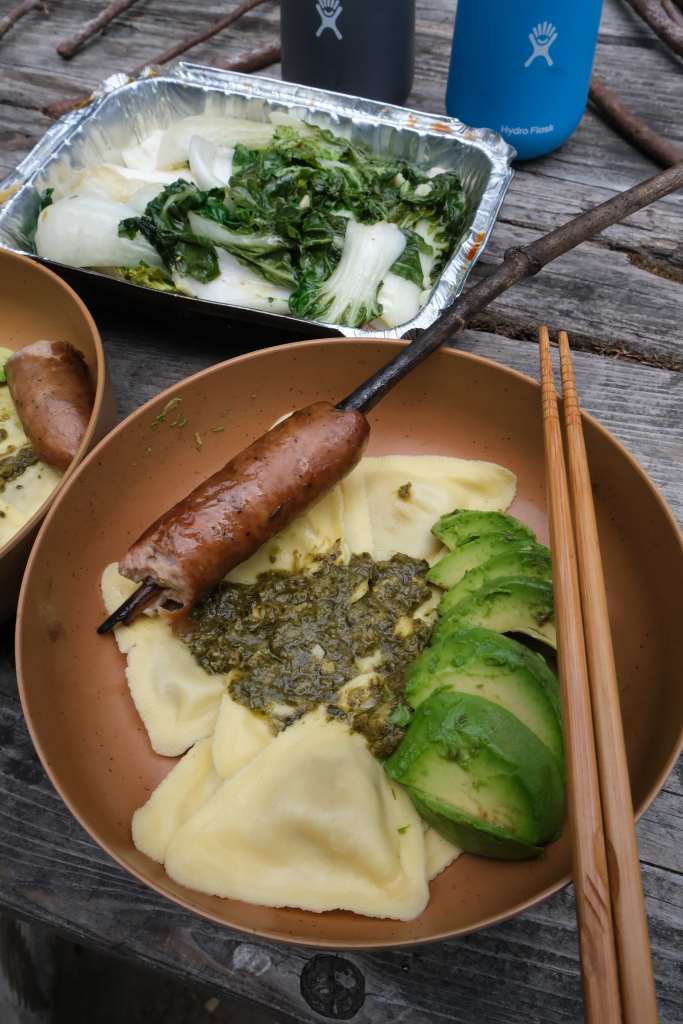 With the daylight fading, we returned to our campsite #48 at Elk Prairie Campground. Tip for next time (keep this in mind as you select your campsite at time of reservation): Campsite #48 had a small bushwhacked path with access to the stream behind it, but our neighbors at campsite #50 had easy direct access to the water, so I recommend choosing that campsite if it’s available. Of course, I had to make a campfire for dinner (and ambiance). Tonight’s dinner included roasted chicken-cheddar-roasted pepper sausages, fire-broiled Chinese veggies with garlic and Chinese sausage, and mushroom truffle ravioli (from Trader Joe’s).