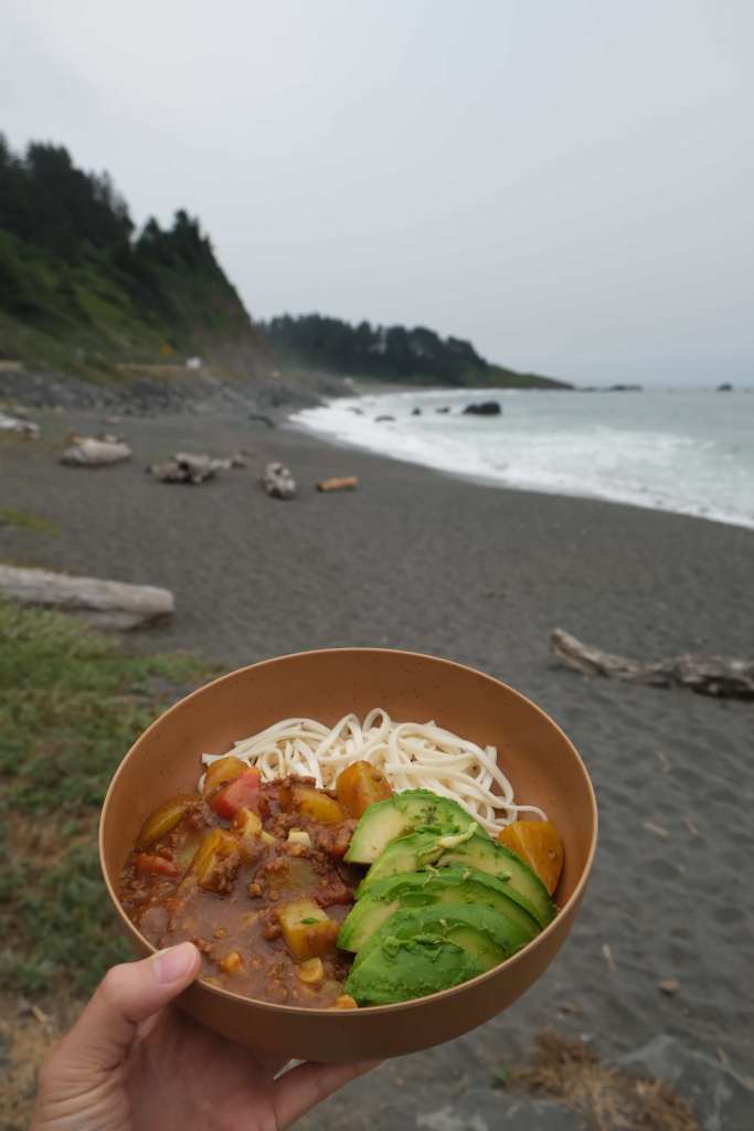 There is very limited (meaning only one) picnic table area, so we ended up cooking and eating right outside the van. The views and sounds of the beach are wonderful. You can really sense the power of the ocean here. We cooked up a curry with ground beef, fried potato, and tomato over a bed of noodles with garlic naan on the side.