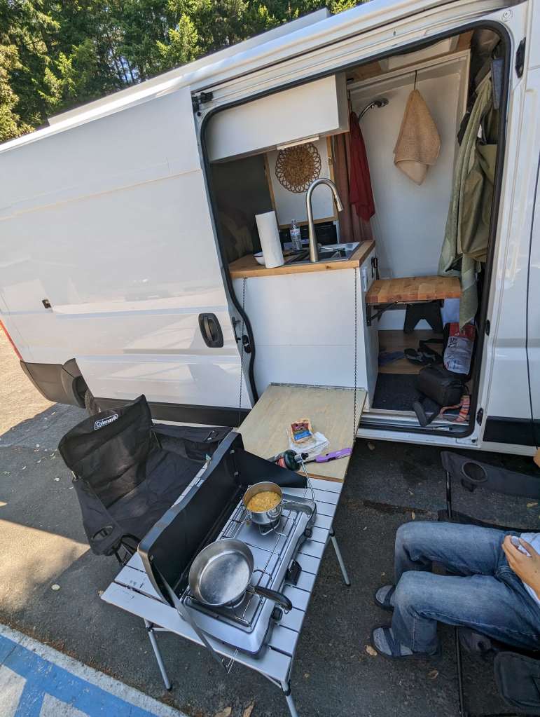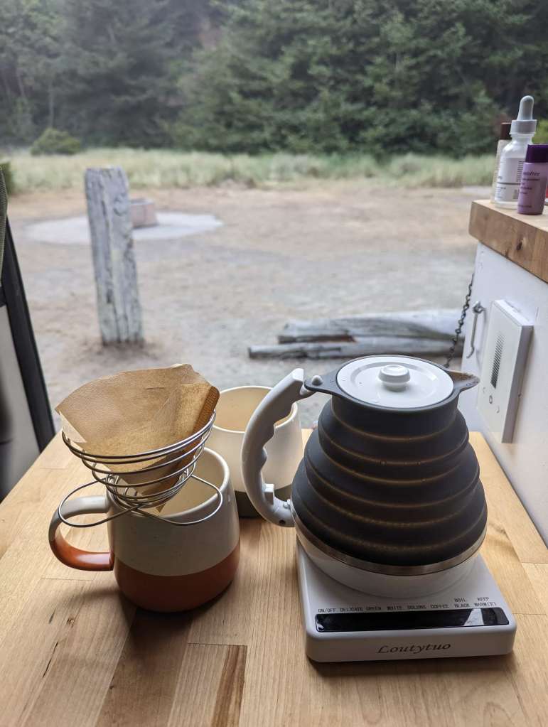 Breakfast in the van was again cheese bread with peanut butter, honey, and cinnamon, along with a pour-over coffee.
