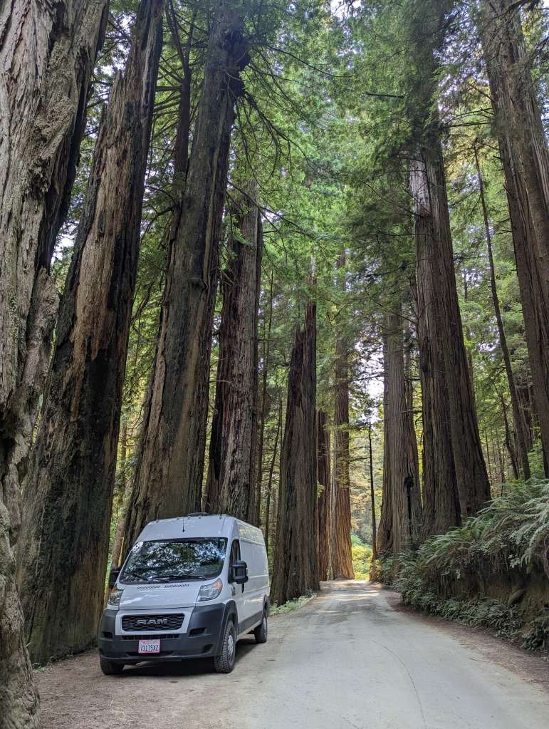 At the time of this wondrous road trip through the Redwoods National and State Parks, we weren’t **total** strangers to van-life road trips to beautiful places. Our epic DIY camper van trip from Vancouver road-tripping our way to Banff and Jasper hooked me on this way of travel. I loved the odd sense of security of having everything you own and need to account for (at least for that trip) physically in your vehicular apartment, and being able to move the comfort of that temporary home to awe-inspiring locations. All this to say, when we decided to visit the California Redwoods, I knew I wanted to travel via camper van!