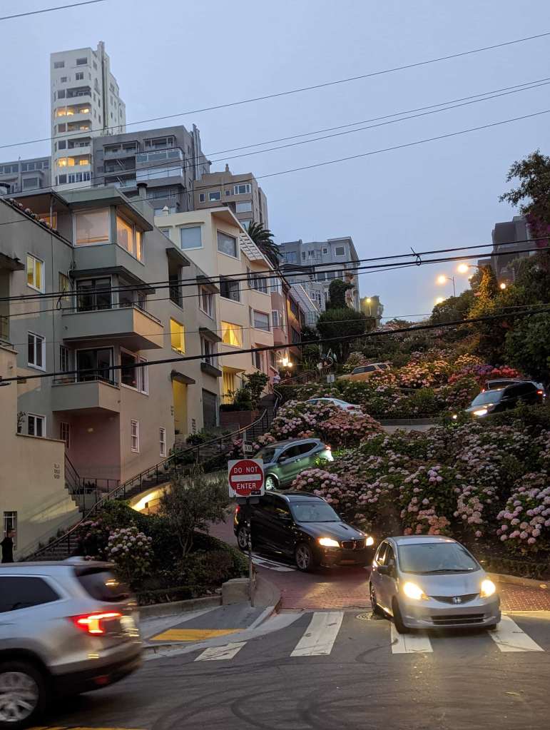 Lombard Street is the famed curvy, windy, super steep, “screechy wheels” street in the Russian Hill neighborhood. It winds up/down a steep hill with sharp switchbacks past expensive Victorian mansions.