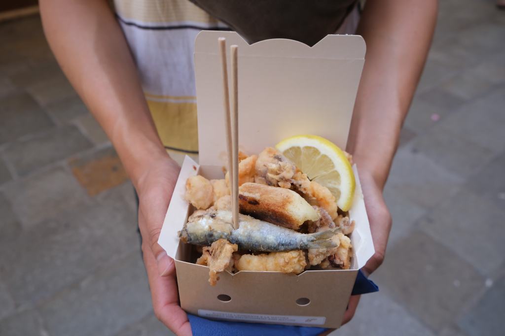 This little street side food stop offers a variety of antipasti, little pizzas, and their most popular item: boxes of freshly fried seafood. We tasted their fried seafood and the salted cod ball. The fried seafood “frittura” box was stuffed full of freshly battered and fried shrimp, calamari, sardine. It was very fresh, not too fishy, and very tasty. I’m not sure if it was worth 15 Euro but I’m glad we experienced it once.