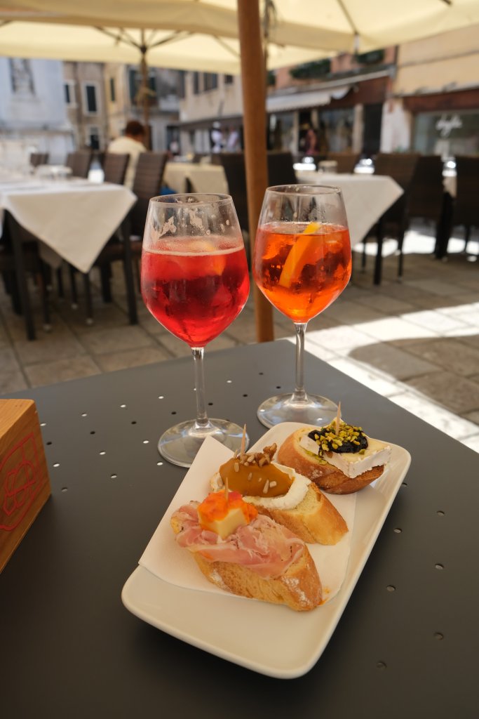 After Doge’s Palace, we wandered around the streets of Venice and happened upon a “bacaro,” a local bar offering food and drink. This marked the first aperol spritz of the trip. The Aperol Spritz cocktail is a popular aperitif that was popularized in the 1950’s in Northern Italy, quickly becoming the drink to drink in Venice. Aperol spritz is typically made with Aperol, Prosecco, and soda water– but there are actually a few different “spritzes” you can choose from in Venice. Aperol spritz is the sweetest of the bunch (and most orange), Campari spritz is the most bitter (and most red in color), and the Select Spritz is the Venetian local option coming in as a happy medium between the two others. (pictured are aperol and select spritz).
