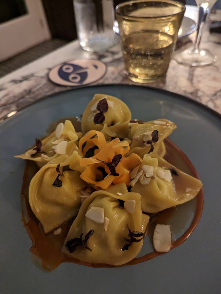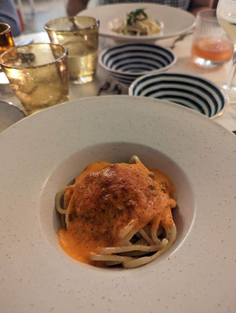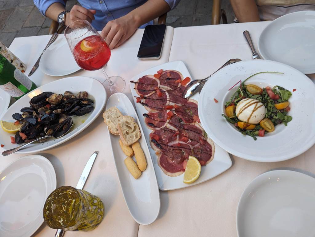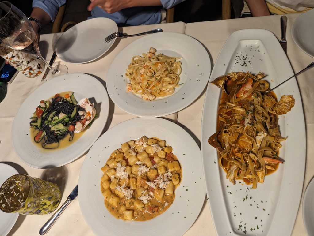 Osteria Boccadoro is a fish-focused Venetian restaurant on the eastern end of the Cannaregio area of Venice. The evening began with Aperol spritzes and glasses of wine. The table was then laden with delectable appetizers of sauteed clam and mussel, duck prosciutto, and baratta salad before we indulged in four different pasta presentations: lemon tagliatelle with prawn, squid ink tagliolini with zucchini, gnochietti with snow crab, and tagliatelle with freshly caught blue crab. We usually don’t eat like this on our travels, but this was such a treat!