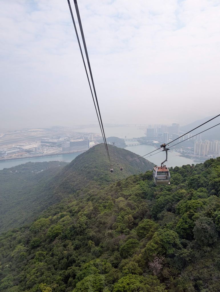 We booked one way rides on the standard (non-Crystal) cable car from Tung Chung to Ngong Ping, which cost HK$195 per person. The cable car ride was 25 minutes of elevated views overlooking the forested mountains and ocean. The view to the left of the ascending cable cars offers a far away sneak peak of the Big Buddha and Po Lin Monastery.