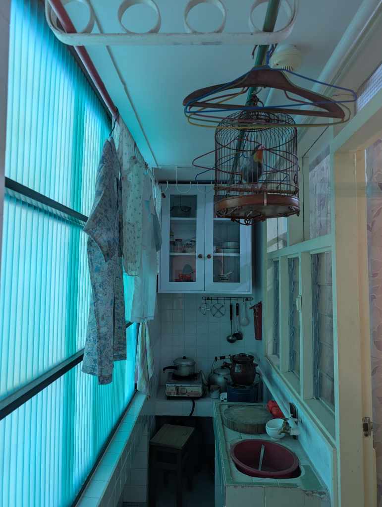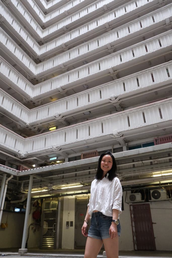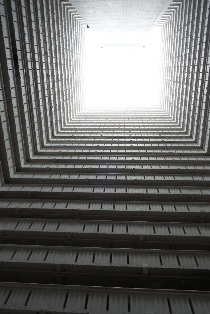 Ping Shek Estate was built in the 1970’s. An open-air courtyard offers a stunning view of a square of blinding daylight set against the deep shade of towering vertical walls of residential doors.
